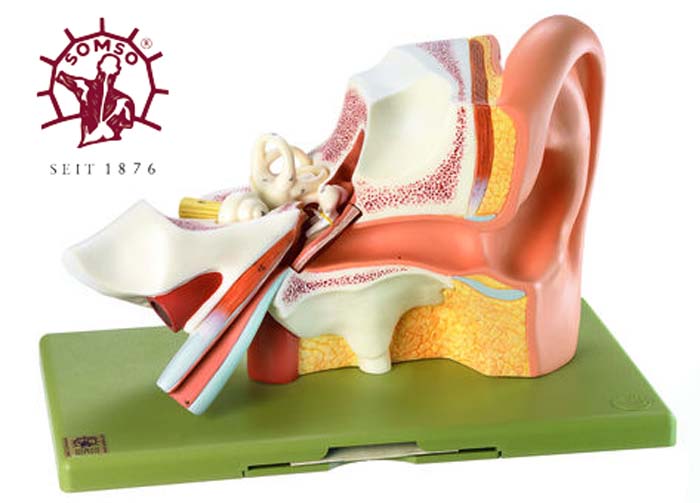 herausnehmbar sind:- Trommelfell mit Hammer- Amboß- Labyrinth mit SteigbügelAuf Sockel.Maße: 21 x 32 x 19 cm, Gewicht: 1,2 kg