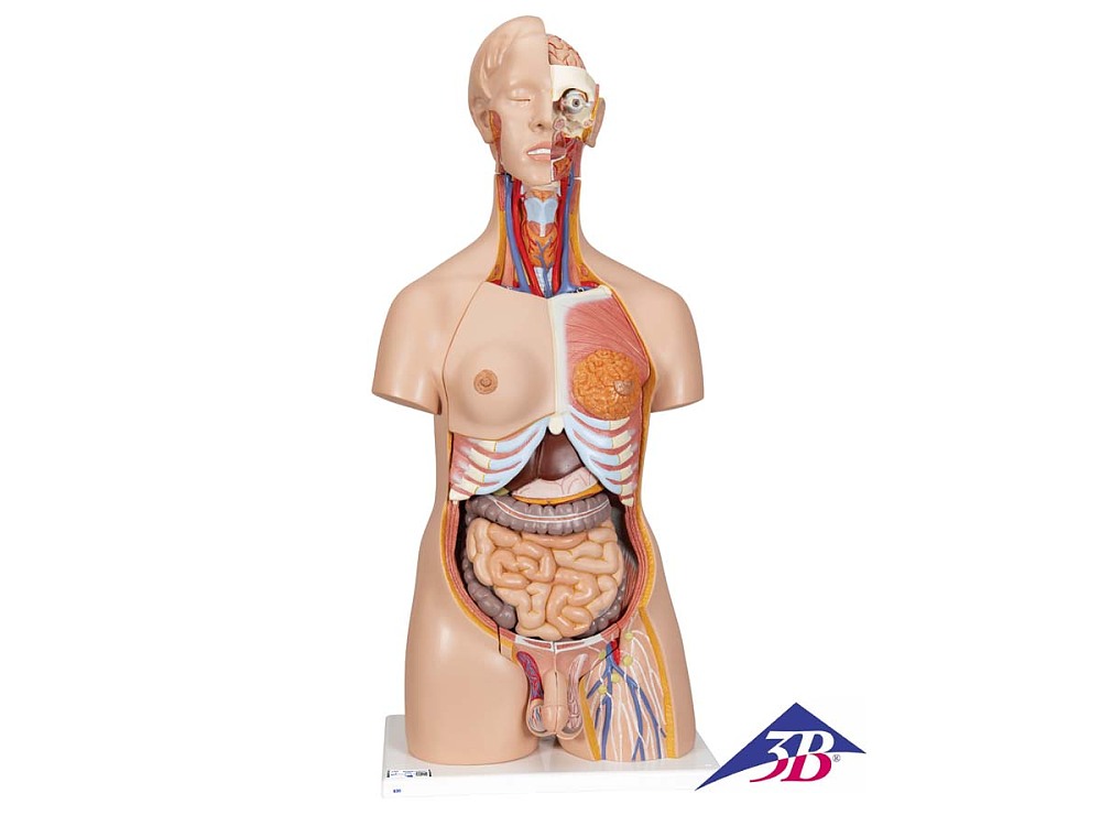 Luxus Torso Modell, mit weiblichen & männlichen Geschlechtsorganen, 24-teilig - 3B Smart Anatomy24-teilig, Maße: 87 x 38 x 25 cm, Gewicht: 7,5 kgDer 3B Scientific Luxus-Torso bietet Ihnen alle Möglichkeiten für ausführliche Demonstrationen. Sie erhalten hunterprozentige Qualität und einen hohen Grad an Detailarbeit. Die Beschaffenheit der erweiterten Torso-Version ist beeindruckend, genau wie sein Preis! Beantworten Sie mit seiner Hilfe alle Fragen zur inneren Anatomie des Menschen. Er ist zerlegbar in:- 3-teiligem Kopf- 2-teiligem Magen- 4-teiligem Darmpaket- Weibliche Brustdecke (2-teilig)- 2 Lungenhälften- 2-teiliges Herz- Leber mit Gallenblase- Vordere Nierenhälfte- 3-teiliger weiblicher Genitaleinsatz mit Embryo- 4-teiliger männlicher GenitaleinsatzAlle Organe in diesem menschlichen Torso sind von Hand bemalt.Lieferung mit 3B Torso-GuideMit jedem originalen 3B Scientific®-Anatomiemodell erhalten Sie über Ihr Smartphone, Tablet oder Desktop-Gerät direkten Zugang zu seinem digitalen Zwilling.Freuen Sie sich auf exklusive virtuelle Anatomieinhalte mit folgenden Leistungsmerkmalen:1. Freies Drehen und Vergrößern/Verkleinern Ihres digitalen Modells2. Anzeige von Hotspots und ihrer anatomischen Strukturen3. Augmented Reality (AR)-Funktion startet Ihr virtuelles Anatomiemodell4. Anatomie-Quizfunktion zum Überprüfen und Verbessern Ihrer Anatomiekenntnisse mit sofortigen Ergebnissen und abschließender Berechnung Ihrer Punktzahl4. Zeichenfunktion für die Bildanpassung mit Funktionen zum Speichern und Weiterleiten6. Nützliche Notizfunktion, die Ihnen beim persönlichen Lernen hilft7. Möglichkeit zum Erlernen der männlichen und weiblichen Anatomie8. Einfacher Zugang zu 3D-Inhalten sowohl online als auch offline9. In 11 Sprachen erhältlichScannen Sie einfach den QR-Code auf Ihrem 3B Scientific®-Anatomiemodell, laden Sie die neue 3B Smart Anatomy-App herunter und betreten Sie die virtuelle Welt der menschlichen Anatomie.Klicken Sie hier, um mehr zu erfahren.
