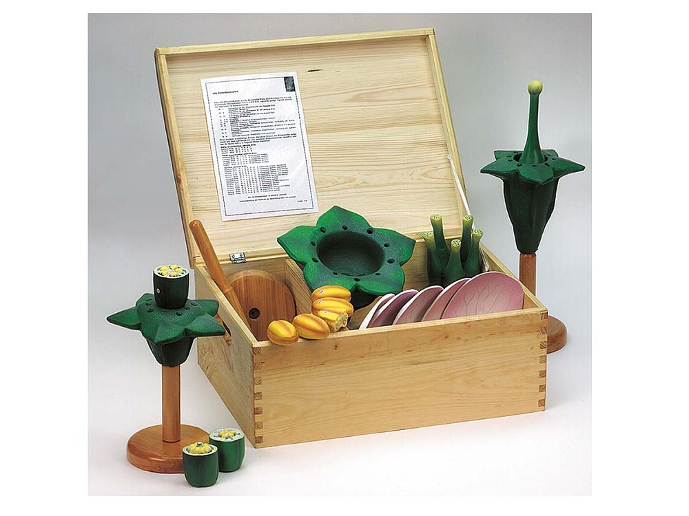 Im Holzkasten: aus echtem Holz, mit Klappdeckel, zwei Scharnieren, sowie zwei Handgriffschlitzen gefertigt. Die handlich raumsparende Ausführung ist mit Beschreibung der Darstellungsmöglichkeiten der verschiedenen Blütentypen ausgestattet. Größe: 40 x 30 x 17 cm, Gewicht: 4,000 kg (Abbildung)