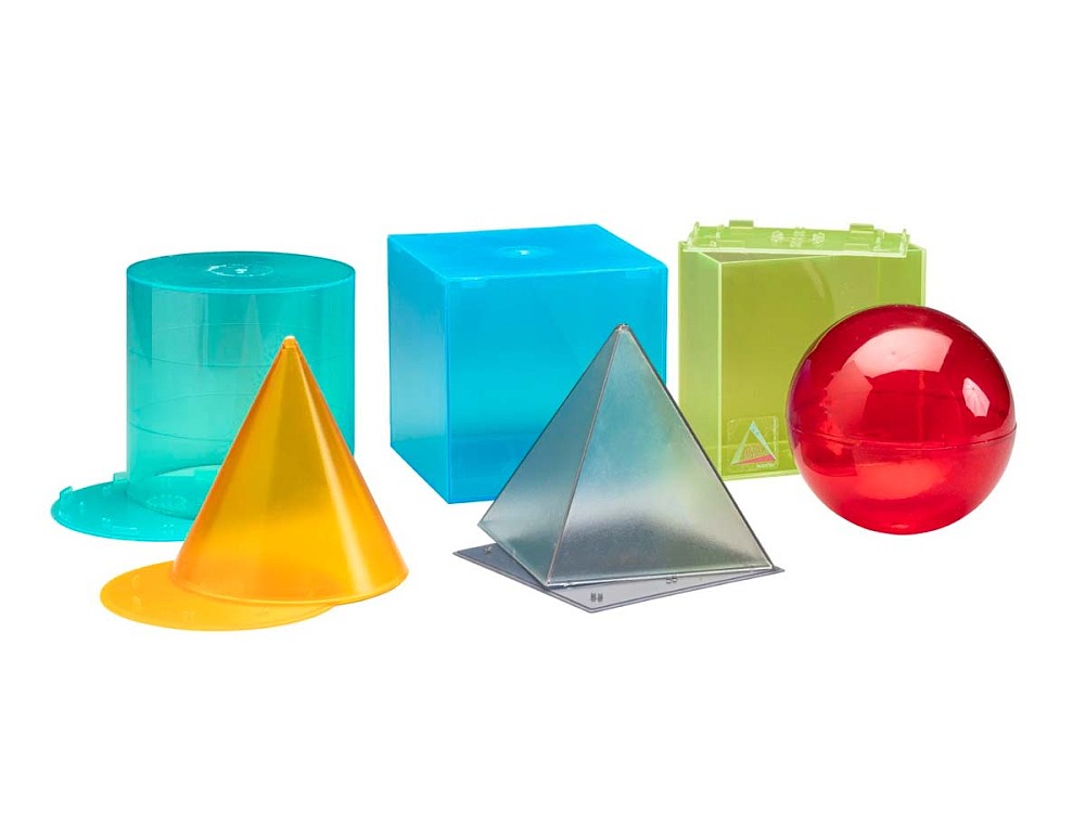 Der Satz besteht aus: - Würfel - Quadratpyramide - Rechtecksäule (10 x 5 x 10) - Zylinder - Kegel - Kugel Alle Modelle werden mit separaten Böden angeliefert, um so direkte Volumenvergleiche durch Ineinanderstecken zu erhalten. Im Karton mit Begleitheft.