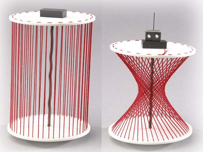Fadendrehmodell: Zylinder und Doppelkegel.Beim Verdrehen der oberen Scheibe gegen die untere bilden die Fäden die Oberfläche eines einschaligen Hyperboloids.