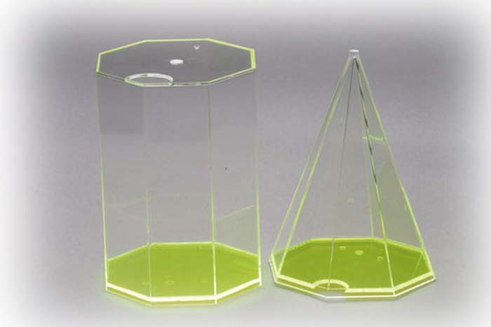 Beschreibung: 8-seitiges Prisma und 8-seitige Pyramide als Füllkörper. Die Körper sind hergestellt aus Plexiglas, ein besonders hochwertiger Kunststoff. Die Böden der Körper sind fest verklebt und können nicht abgenommen werden. Als Füllmaterial empfiehlt der Hersteller rote Linsen. |