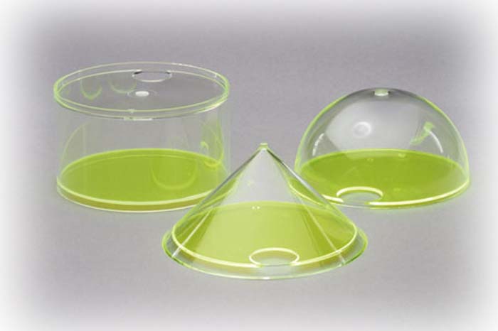 Die Körper sind hergestellt aus Plexiglas, ein besonders hochwertiger Kunststoff.Die Böden der Körper sind fest verklebt und können nicht abgenommen werden.Als Füllmaterial empfiehlt der Hersteller rote Linsen.