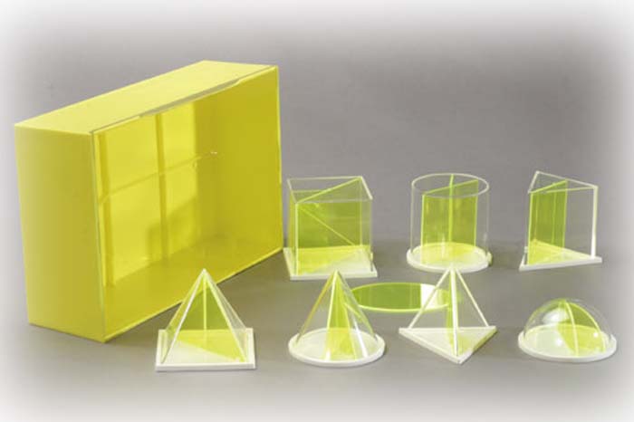 Beschreibung: Mini Satz aus 7 geometrischen Körpern mit entnehmbaren Schnitten, für die Hand des Schülers. - Kegel - Zylinder - Halbkugel - 3-seitiges Prisma + Pyramide - Würfel + quadratische Pyramide Höhen: 6,5 cm Im stabilen Sichtkasten eingeordnet, mit mehreren Schnitten pro Modell. |