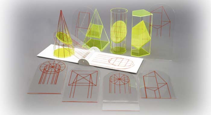 Beschreibung: Modellsatz zur Bestimmung der wahren Größe von Schnittflächen. Kegel, Zylinder, 4-seitige Pyramide und 5-seitiges unregelmäßiges Prisma, schräggeschnitten. Grundplatte mit Klappscharnier und 8 transparente Platten mit siebgedruckten Projektionslinien. |