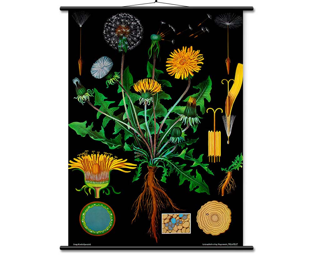 Lehrtafel - LöwenzahnDie Lehrtafeln der Reihe "Botanik" bilden ein Unterrichtswerk, dessen pädagogischer Wert international anerkannt ist. Auf dunklem Grund sind jeweils das Gesamtbild und wichtige Details dargestellt sowie Entwicklungsstadien von Blüte und Frucht.- auf Leinwand- mit stabilen Holzstäben