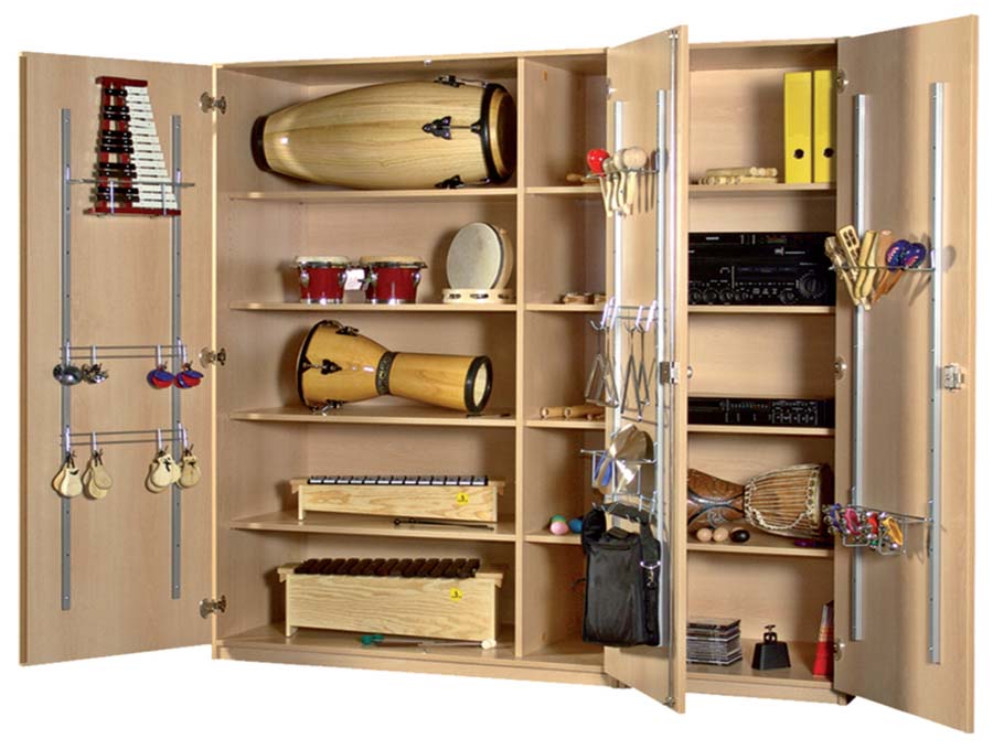 Dieser große, dreitürige Hoch schrank mit 2 Trennwänden und Sockel bietet sehr viel Raum für eine übersichtliche und sichere Aufbewahrung der unterschiedlichsten Musikinstrumente. Die Trennwände stehen nicht mittig, so dass im linken Schrankteil auch größere Instrumente aufbewahrt werden können. Zur Innenausstattung gehören serienmäßig 4 höhenverstellbare Einlegeböden in jedem Schrankteil. Die Türinnenseiten sind mit einem variablen Hängesystem ausgestattet, das durch unterschiedliche Ablage- und Aufhängekomponenten ergänzt wird.