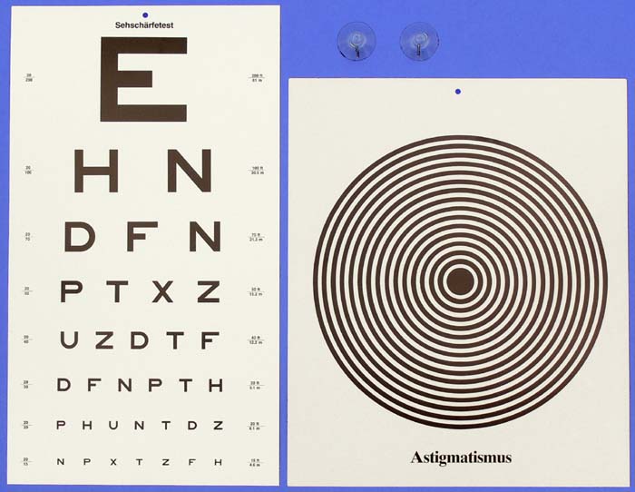 2 Tafeln aus Karton 55 x 30 cm mit Aufhängung und Anleitung.Ein Test gibt interessante Aufschlüsse über Sehschärfe und über einen möglichen Astigmatismus der Schüler.