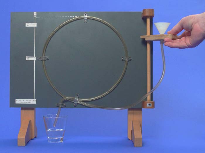 Beschreibung: Alles oder Nichts-Impuls - Funktionsmodell zur Darstellung des Aktionspotentials, nach Maier Es werden demonstriert: - Ruhestand einer Nervenzelle (Ruhepotential) - Veränderung der Membranspannung gegenüber der Ruhespannung - Dauer der lokalen Reizantwort auf die Dauer des Reizes - Darstellung des Schwellenwertes - Aktionspotential - "Entlerrung" des Systems - Darstellung der Refraktärphase (Nicht-Erregbarkeit der Axonmembran) Das Modell besteht aus einem mit Wasser gefüllten bes. angeordneten Schlauchsystem. Die dargestellten physikalischen Vorgänge sind analog auf die Vorgänge bei der Nervenerregung anwendbar. Mit Arbeits-Info für den Lehrer. |