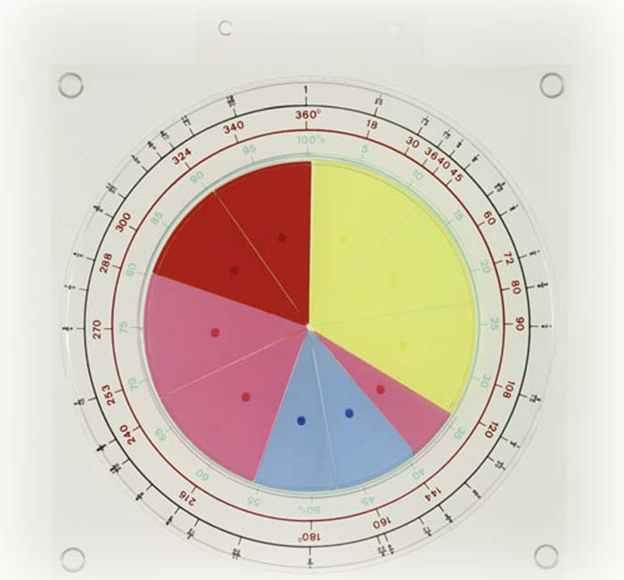 Rechenkreis mit auswechelbaren Kreisteilen und Skalen für die Darstellung von echten Brüchen, Prozentwerten, Winkelwerten und Kreisteilen.Zur Behandlung einfacher Bruchrechnungsarten.Modell aus Plexiglas, hochwertiger Kunststoff