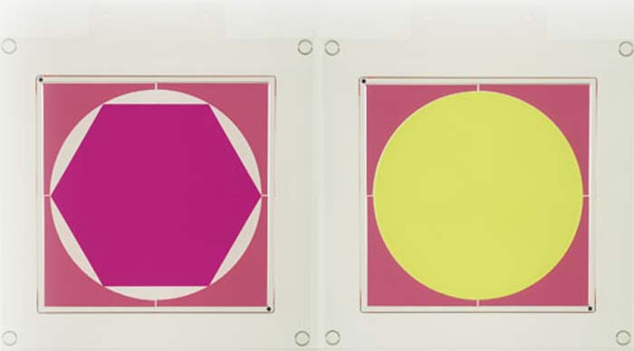 Projektionsmodell zur Berechnung des Kreisumfanges durch Näherungsverfahren über ein- und umgeschreibene Vielecke; zerlegbar, verschiedenfarbig transparente Flächen.Modell aus Plexiglas, hochwertiger Kunststoff
