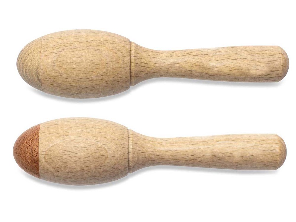 Maracas aus BucheMaracas gehören zur Instrumentensorte der Gefäßrasseln. Sie bestehen aus einem hohlen Korpus, unterschiedlichen Füllungen und einem Handgriff. Sie werden paarweise benutzt, können abwechselnd oder gleichzeitig gespielt werden.Gefüllt werden die Maracas mit Stahlsand. Die ergonomisch angenehme Form der Griffe macht es Kinder vom Krippen- bis hin zum Grundschulalter möglich, auf bequeme und leichte Art und Weise fröhliche Klänge zu erzeugenMaracas Buche/gedämpfte Buche - MediumDie Medium Maracas besteht aus feinstem heimischem Buchenholz und hat einen warmen Klang. Der obere Teil des Klangkörpers ist aus gedämpfter Buche. Damit unterscheidet sich die Rassel schon optisch von der Maracas Hoch, die hell klingt.Maracas Buche - HochDie Maracas Hoch ist mit feinem Stahlsand gefüllt und hat einen hellen Klang. Zur optischen Unterscheidung von den anderen Maracas wird das obere Ende des Klangkörpers sowie der Rest der Rassel aus heimischem Buchenholz gefertigt, dass wir mit einem Wachsfinish veredeln.Solange Vorrat reichtMaracas Buche - Hoch - Akazie = Klangfarbe fein noch 2 Stück auf LagerMaracas Buche/gedämpfte Buche - Medium - Jatoba = Klangfarbe mittel noch 1 Stück auf LagerPreis pro Stück