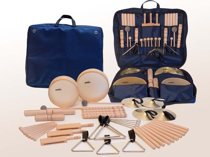 Instrumente für Gruppen bis 24 Kinder.Tasche gibt es in bunt (Abbildung) abwaschbar oder als Leinen hell waschbar.Inhalt:- 5 Paar Claves 200 x 18 mm- 1 Röhrenholztrommel klein- 1 Röhrenholztrommel gross- 4 Raspelstäbe- 3 Holzblocktrommeln mit Schlägel- 3 Triangeln 10 cm mit Schlägel- 2 Triangeln 15 cm mit Schlägel- 2 Paar Cymbeln 15 cm ø, Messing- 1 Tambourin 20 cm ø, Naturfell- 1 Tambourin 20 cm ø mit 7 Schellen, Naturfell- 5 Kugelschlägel 25 mm ø, Holz- 2 Filzschlägel Insgesamt 30 Instrumente mit Schlägeln = 46 teiliges Set