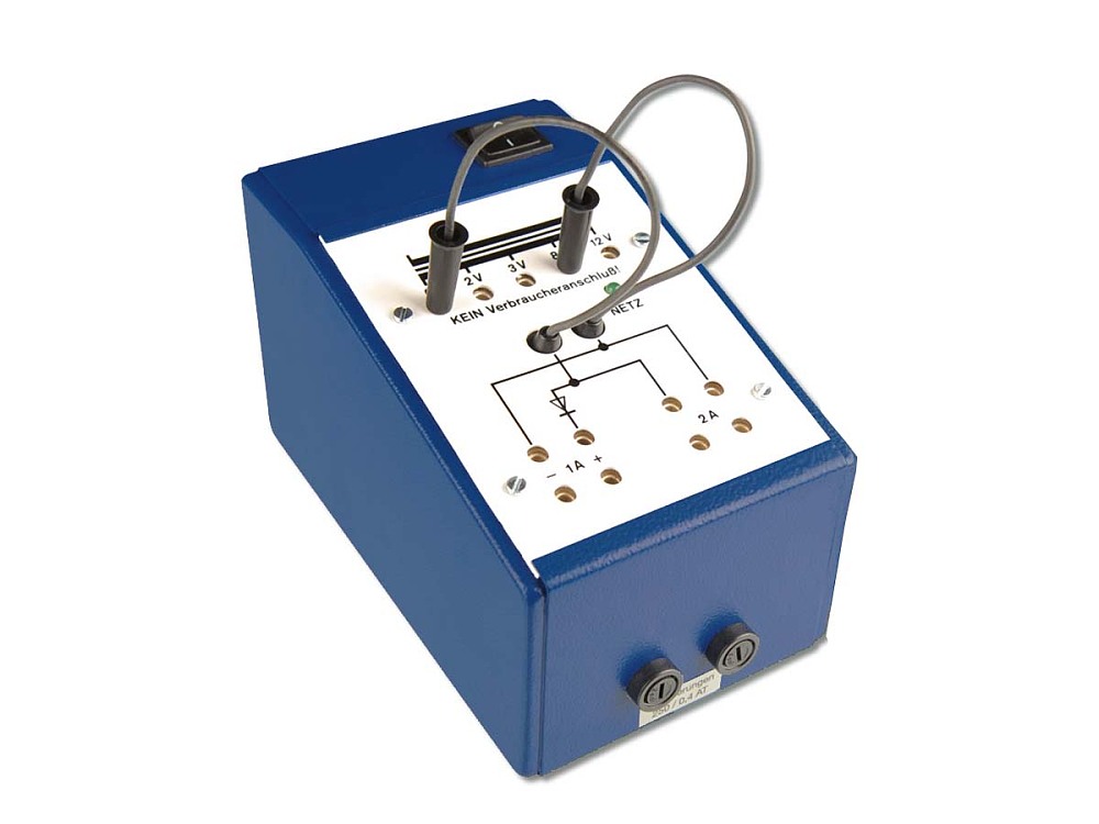 Die Wahl der Spannung erfolgt mit Hilfe der flexiblen Anschlussleitungen, welche in zwei der vorhandenen Spannungsbuchsen 0…12V eingesteckt werden. Außer den angegebenen Spannungswerten können in Differenzsteckweise alle Zwischenwerte abgenommen werden. So erhält man z. B. 1V, wenn die Lamellenstecker in die Buchsen 3V und 2V eingesteckt werden (3 - 2 = 1).