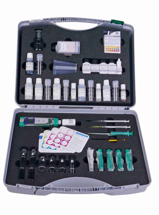 Mit visuell kolorimetrischer Auswertung jetzt mit CALDUR Reagenzien! Alles in herausnehmbaren Hartschaumstoffeinsätzen übersichtlich geordnet. So haben Sie Reagenzien und Hilfsmittel auf einen Blick. Die zum Koffer gehörenden sehr gut abzulesenden Farbkarten mit 6 Farbfeldern ermöglichen eine sichere Auswertung.