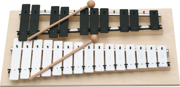 Metallophon chromatisch, 25 schwarz/weiß Klangplatten Stahl 20 x 2 mm, mit Halbtönen g2 - g4, Grundplatte aus Sperrholz, klangrein gestimmt, Rahmen auch Fichte, mit 2 Holzkugelschlägel.In einer bunten SB-Verpackung.