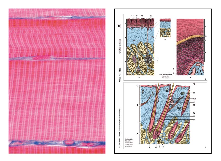 Beschreibung: 1. Plattenepithel aus der Mundschleimhaut des Menschen, Ausstrich - 2. Hyaliner Knorpel vom Kalb, quer - 3. Knochen vom Rind, quer. Färbung der Knochenzellen und ihrer Ausläufer - 4. Quergestreifte Muskeln vom Säugetier, längs - 5. Glatte Muskeln vom Säugetier, quer und längs - 6. Blut vom Menschen, Ausstrich, Giemsafärbung