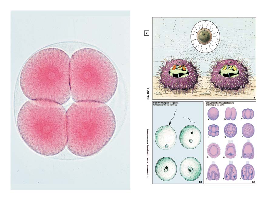 Beschreibung: 1. Mitosen im Knochenmark eines Säugetieres, Ausstrich - 2. Meiose- und Mitosestadien im Hoden der Maus, quer - 3. Eier vom Seeigel. Unbefruchtete und befruchtete Eier, die ersten Furchungsstadien - 4. Gallus, Huhn, Eierstock, quer, Eientwicklung und Dotterbildung - 5. Eierstock vom Kaninchen, quer. Follikelbildung - 6. Spermatozoen vom Rind, Ausstrich.