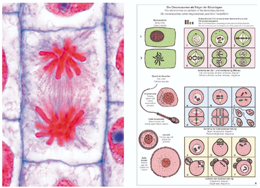 Beschreibung: 1. Zellteilungen (Mitosen). Wurzelspitzen von Allium, Küchenzwiebeln, längs. Alle Teilungsstadien. Färbung mit Eisenhämatoxylin - 2. Mitosen in der Keimscheibe eines Fisches, Schnitt. Zentrosphären - 3. Hoden der Maus, quer. Spermatogenese - 4. Riesen-chromosomen aus der Speicheldrüse der Chironomuslarve, Quetschpräparat, Spezial- färbung - 5. Lilium, Antheren quer. Pollenmutterzellen, späte Prophase - 6. Lilium, Antheren quer. Pollenmutterzellen, Metaphase und Anaphase der zweiten Reifungsteilung.