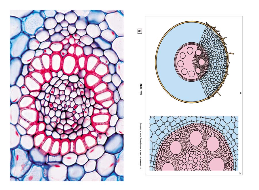 Beschreibung: 1. Mais, Wurzel, quer - 2. Hahnenfuß, typische dikolyle Wurzel, quer - 3. Wurzelspitze mit Wurzelhaaren, quer. Epidermaler Ursprung der Wurzelhaare - 4. Liane, Wurzel, quer. Verdickte Endodermis, mehrschichtiger Perizykel - 5. Wasserpest, Wurzel einer Wasserpflanze, quer - 6. Lupine, Wurzelknöllchen mit symbiontischen Bakterien (Stickstoffbinder), quer