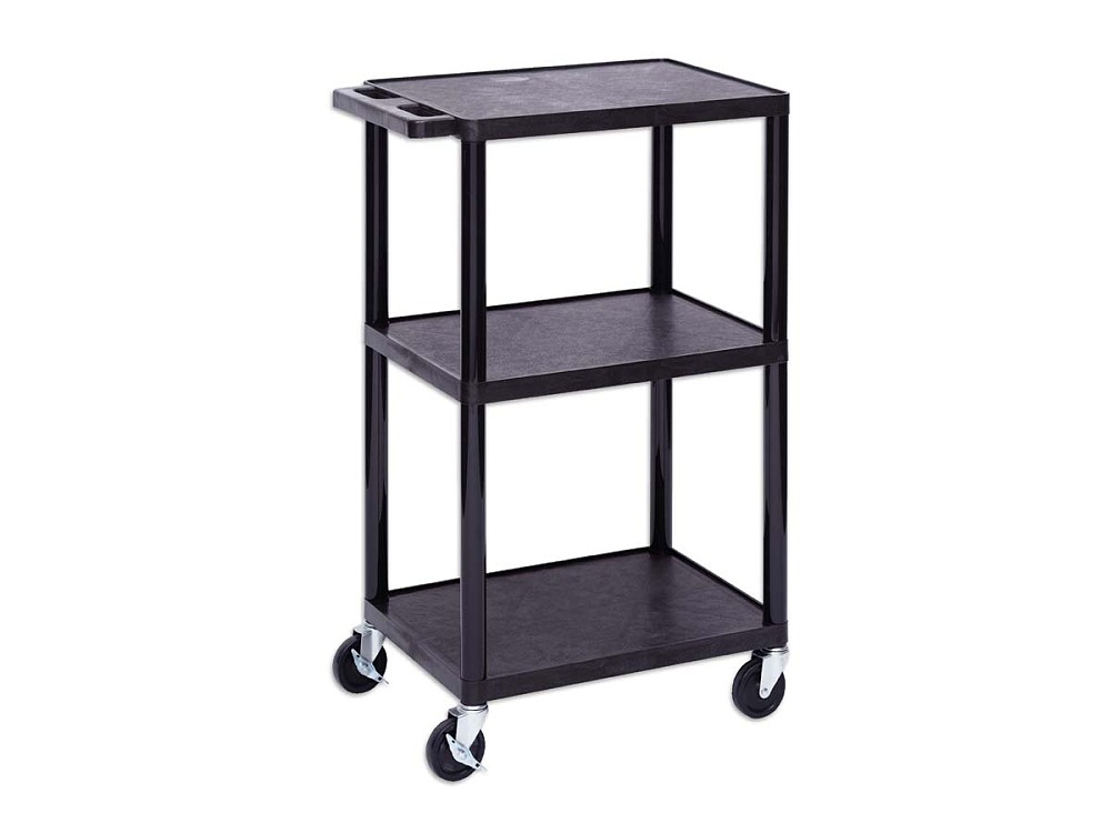 Beschreibung: - Extreme Stabilität und Tragkraft - leichte Montage - Hohe Mobilität: 4 Rollen (2 feststellbar) - Holme: schlag- und kratzfester Kunststoff, schwarz - obere Ablagefläche und Transportgriff in einem Stück - Ablageplatten: 60 x 45 cm - Belastbar bis 80 kg