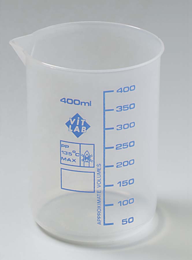 Becherglas aus Polypropylenmit Ausguss und Graduierung, verschiedene Inhalte