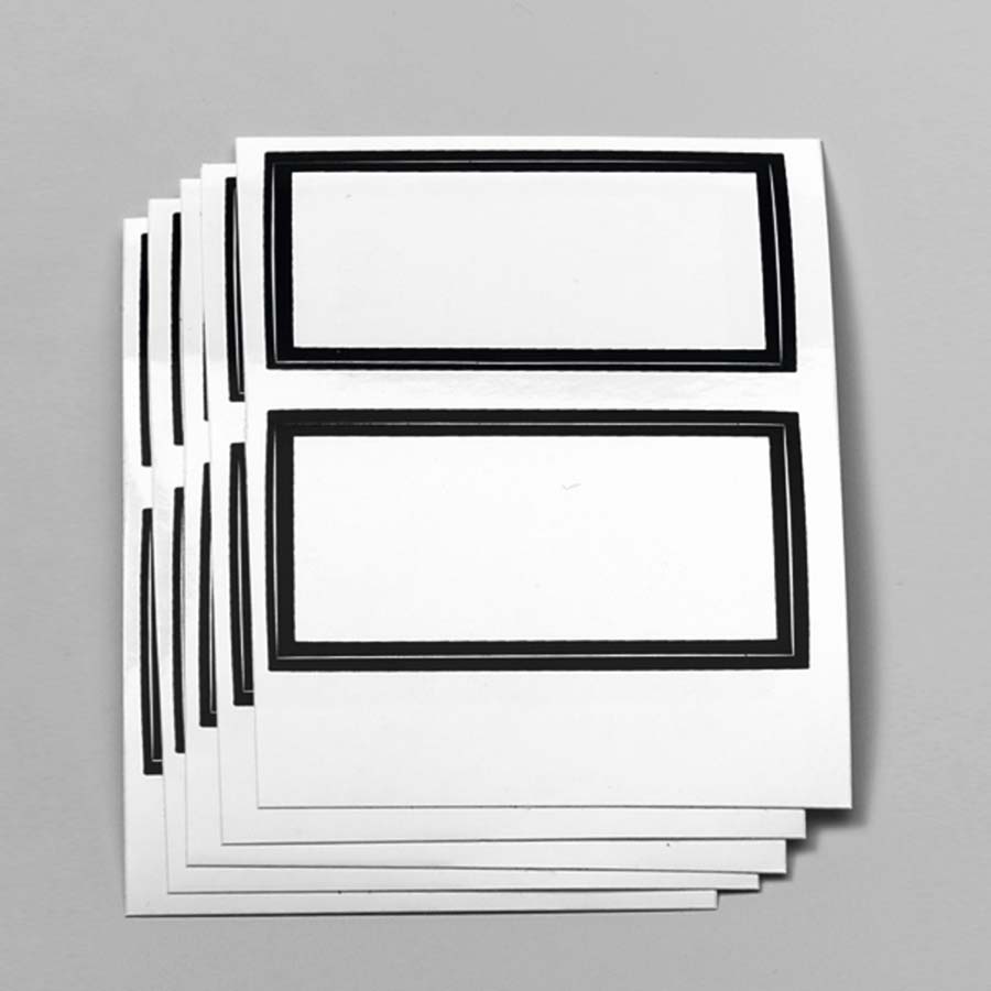 Aus weißer, lichtechter, chemikalienbeständiger Kunststofffolie, mit schwarzem Rand und Selbstklebegummierung zum selbst Beschriften.