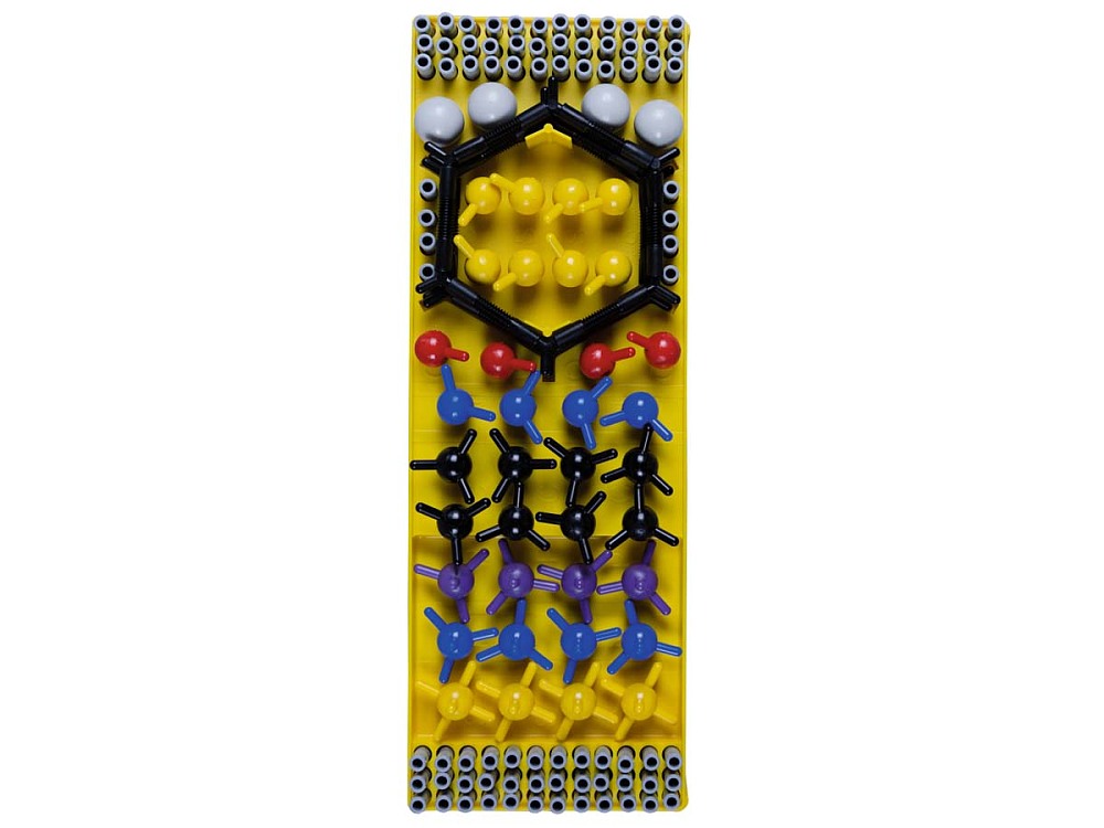 Inhalt: - 4 Schwefelatome, gelb, sechswertig - 8 Kohlenstoffatome, schwarz, vierwertig - 8 Schwefelatome, gelb, zweiwertig - 4 Sauerstoffatome, rot, zweiwertig - 4 Phosphoratome, violett, fünfwertig - 4 Universalbausteine, grau, einwertig - 4 Stickstoffatome, blau, fünfwertig - 80 Spiralverbindungsstücke, grau - 4 Stickstoffatome, blau, dreiwertig - 3 Benzolring-Modelle, schwarz, zerlegbar - Schüleranleitung Molekülbaukästen 1 und 2