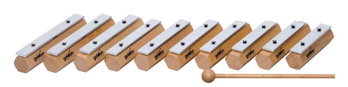 Satz mit 10 Klangbausteinen aus Buche, Klangplatten aus Alu, c2 - c3, fis2 + bb2, 10 Holzkugelschlägel.