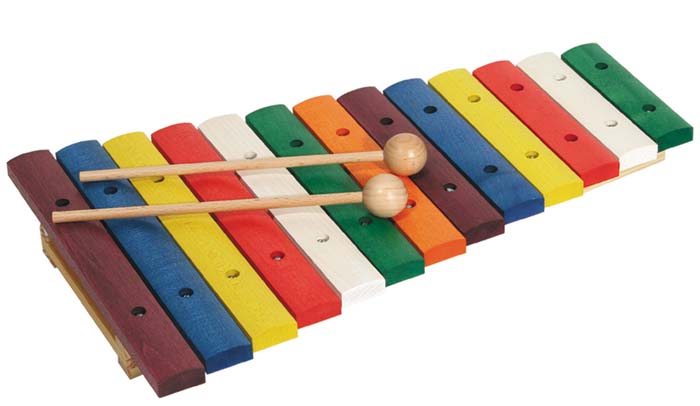 Xylophon mit 13 bunten Klangplatten Ahorn, h3 - g4, Rahmen aus Fichte mit 2 Holzkugels und Liedbeilage.in einer bunten SB-Verpackung.