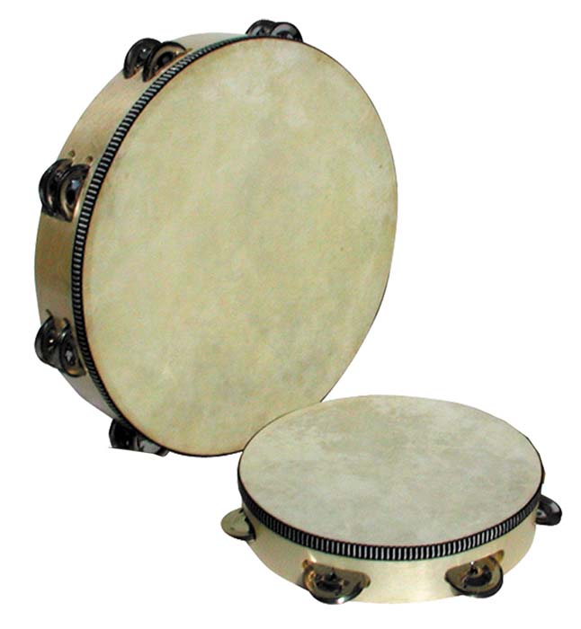 Tamburin mit Naturfell aus Holz.20 cm ø mit 6 Paar Schellen25 cm ø mit 8 Paar Schellen