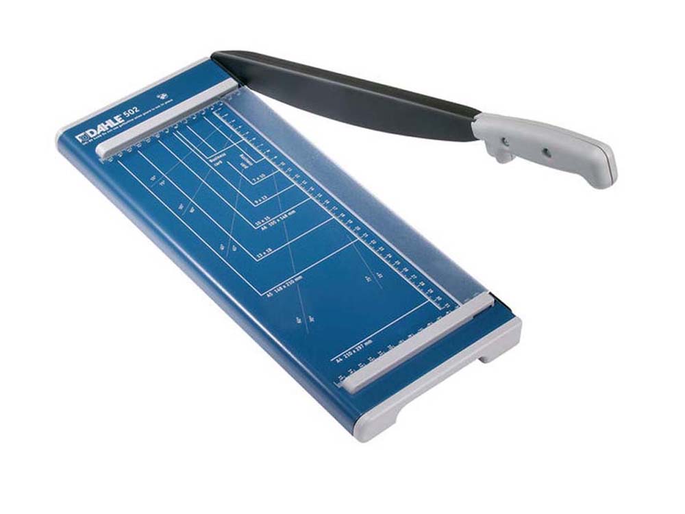 Hebel-Schneidemaschine bis DIN A4Tischgröße: 420 x 175 mm Schnittlänge 320 mm Schnitthöhe 0,8 mm Schnittleistung A4 80 g/qm 8 Blatt