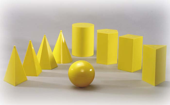 9-teiliger Satz Körper:3-seitiges und 6-seitiges Prisma, Quader, Zylinder, Kegel, 3-seitige, 4-seitige und 6-seitige Pyramide, KugelHöhen: 15 cm, Durchmesser der Kugel: 10 cmFlächen beschreibbar