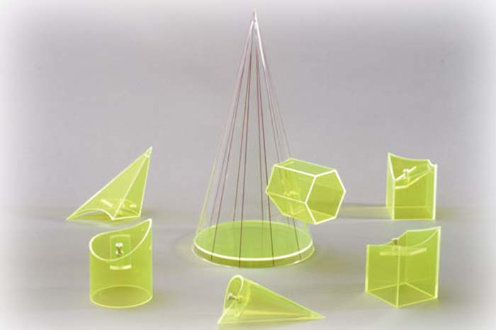Kegel mit 6 Ansteckkörpern:Zylinder, Pyramide, Kegel, 6-seitiges Prisma, 2 Quadratprismen (Kante parallel zur Achse, Diagonale parallel zur Achse).Modell aus Plexiglas, hochwertiger Kunststoff.