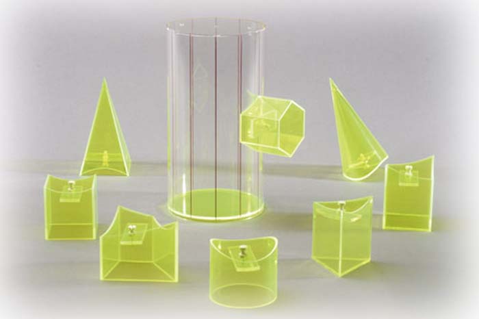 Zylinder mit 8 Ansteckkörpern:3-seitiges Prisma, Zylinder, Pyramide, Kegel, 6-seitiges Prisma, 2 Quadratprismen, TrapezprismaModell aus Plexiglas, hochwertiger Kunststoff.