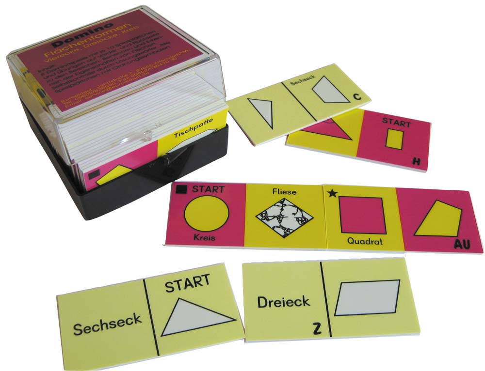 Das Domino enthält 8 Einzelspiele mit je 10 Aufgabenstellungen auf der Vorder- und Rückseite der Dominoplättchen mit Übungen zum Kennenlernen und Wiedererkennen der Flächen (allg. Viereck, Quadrat, Rechteck, Raute, Prallelogramm, Drachen, Sechseck, Dreieck, rechtwinkliges Dreieck, Kreis) in unterschiedlichen Größen, räumlichen Lagen bzw. Anordnungen und an vorgegebenen Kriterien. Jedes Dominospiel sollte mit dem Startplättchen begonnen werden. Sind alle 10 Aufgaben richtig gelöst ergeben die Buchstaben auf den Plättchen ein Lösungswort. Die Ordnungssymbole (Kreis, Quadrat, Dreieck und Stern) helfen bei der Unterscheidung der Einzelspiele. Die aus Kunststoff gefertigten Dominoplättchen werden in einer Box geliefert.Solange Vorrat reichtnoch 2 Stück auf Lager