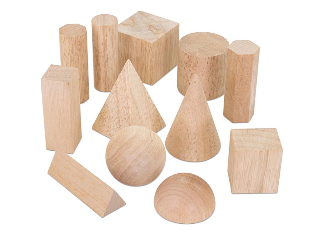 Satz Höhe 7,5 cm, Basis 5 cm. Würfel, Quadratsäule, Rechteckkörper, Dreiecksäule, Sechsecksäule, Achtecksäule, Zylinder, Zylindersäule, Quadratpyramide, Kegel, Kugel, Halbkugel