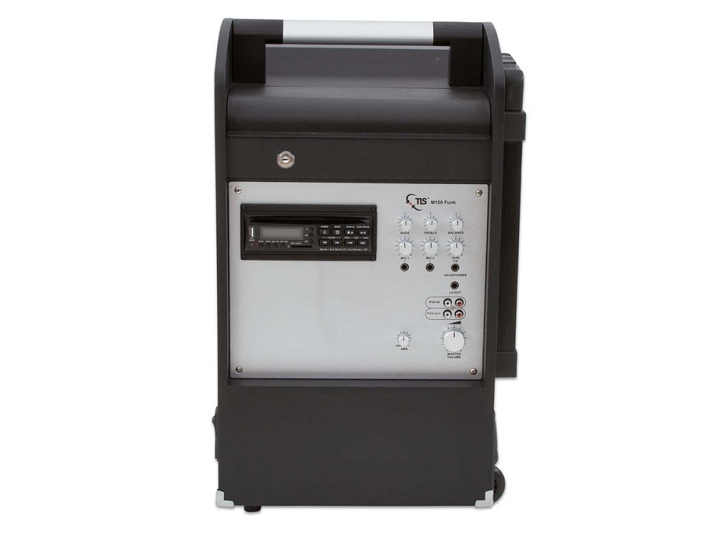 M100 Combiideal für VeranstaltungenKassette, Bluetooth und MikrofonUSB-A- und AUX-IN-Anschlüsse im Fach