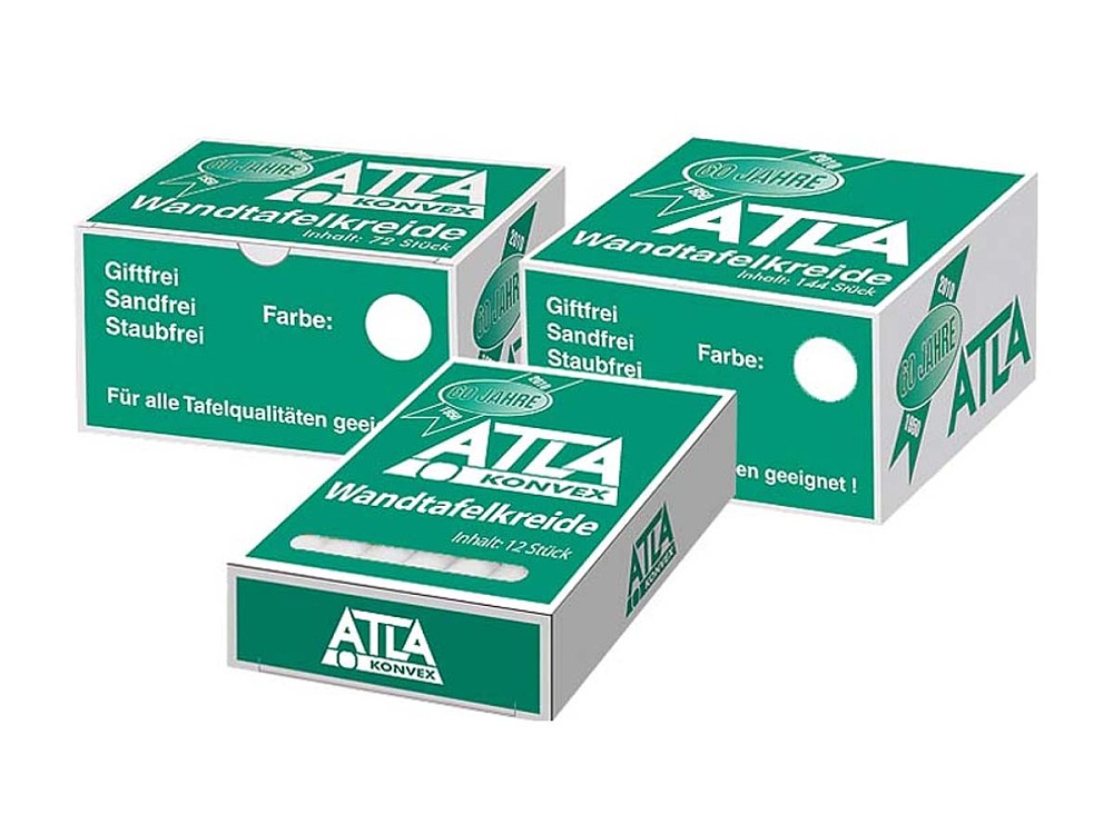 Konvexe Standardschulkreide von ATLA ist seit Jahrzehnten in fast allen Schulen erfolgreich im Einsatz und aufgrund ihrer hohen Qualität "Made in Germany" auch kaum von dort wegzudenken.Produkteigenschaften- leuchtende Farben- weiches Schreibgefühl- für alle Tafeloberflächen geeignet- hohe Bruchfestigkeit- 13mm Durchmesser — 85mm Länge- geprüfte Qualität- staubarm- für alle Tafeloberflächen geeignet- Fingerschutzfilm verringert das abfärben an den Händenverschiedene Abpackung: - 12 Stück- 72 Stück- 144 Stück________________________Hersteller:PyCom GmbH & Co. KGKirchweg 1037635 Lüerdisseninfo@pycom.eu
