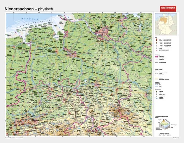Niedersachsen - physisch / politischMaßstab: 1:250 000, Format: 190 x 147 cm, beschreib- und abwaschbar