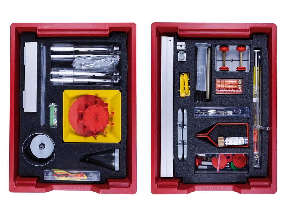 Enthält Geräte und Materialien, die zur Untersuchung der grundlegenden Gesetzmäßigkeiten bei festen, flüssigen und gasförmigen Körpern geeignet sind. Mehr als 50 Einzelteile sind in zwei stabilen Kunststoffwannen (312 x 427 x 75 mm) mit Schaumstoff-Formeinsatz und transparentem Deckel untergebracht. Der Schülerexperimentier-Gerätesatz „Mechanik 1“ wird mit einer ausführlichen Versuchsanleitung und Lehrerhandreichung geliefert. Die Versuchsanleitung enthält Kopiervorlagen mit der Beschreibung der Versuchsdurchführung und Fragen zu den Versuchen. In der Lehrerhandreichung sind die Antworten zu den Fragen aufgeführt.