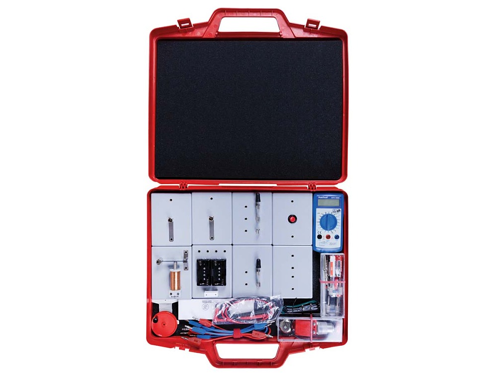 Inhalt: Sockel-Bausteine - Lampenfassungen - Hebelschalter - Hebelumschalter - Stecksockel - Relais-Stecksockel - Drucktaster - Sockel mit Batteriehalter - Abmessung der Sockel-Bausteine: 120 x 90 x 23 mm Steckelemente - Elektromotor mit Schnurrolle - Handkurbel mit Achse - Spule mit Kern - Klingel - Widerstände - Krokodilklemmen - Digital-Multimeter - Satz Materialproben - Heizdraht - Batterien - Glühlampen - Experimentierkabel - Versuchsanleitung |