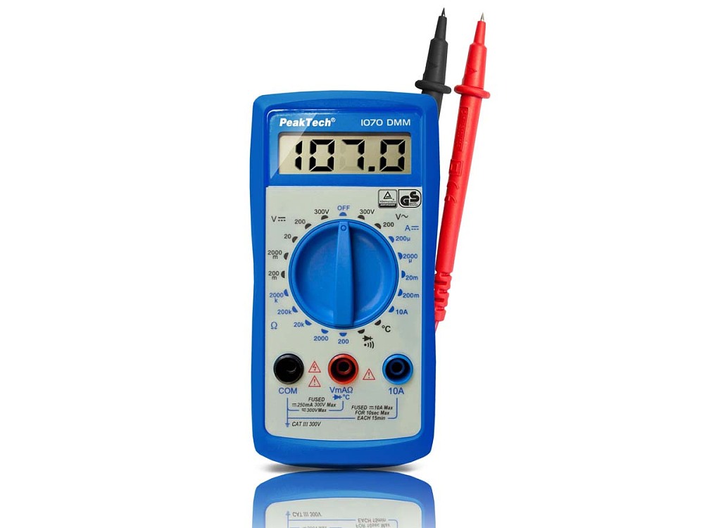 Tragbares Vielfachmessinstrument mit LCD-Anzeige und Messbereichs-Drehschalter. Zur Messung von Gleichstrom, Gleich- und Wechselspannung, Widerstand und Temperatur. Mit Durchgangsprüfung und Dioden- und Transistortestfunktion, manuelle Bereichswahl, in schlagfestem Kunststoffgehäuse, 4-mm-Sicherheits-Anschlussbuchsen, Prüfleitungen, Typ-K-Temperaturfühler, Batterie und Bedienungsanleitung. Technische Daten: Messbereiche - Spannung DC: 200 mV, 2, 20, 200, 600 V ±0,5 % - Spannung AC: 200, 600 V ±1,2 % - Strom DC: 2, 20, 200 mA, 10 A ±1,2 % Widerstand: 200, 2000 O, 20, 200, 2000 kO ±1,0 % Temperatur: 0 bis 1000 °C ±2,5 % Stromversorgung: 9-V-Blockbatterie Anzeige: 3½-stellig, 13 mm hoch Sicherheit: IEC 1010-1; CAT II 600 V Abmessungen: 70 x 128 x 28 mm Masse: 140 g |