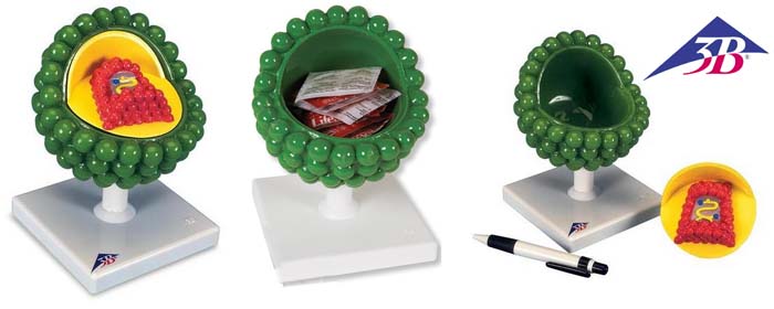 Beschreibung: Diese millionenfache Vergrößerung des HI-Virus zeigt die äußere Lipidhülle mit Proteinstrukturen. Der Innenkörper, der die Virus-Erbsubstanz (RNA) enthält, ist abnehmbar. Zur Demonstration der Hauptpräventionsmaßnahmen gegen die HIV-Infektion können Kondome in das Modell gelegt werden. Lieferung auf Stativ, ohne Kondome. |