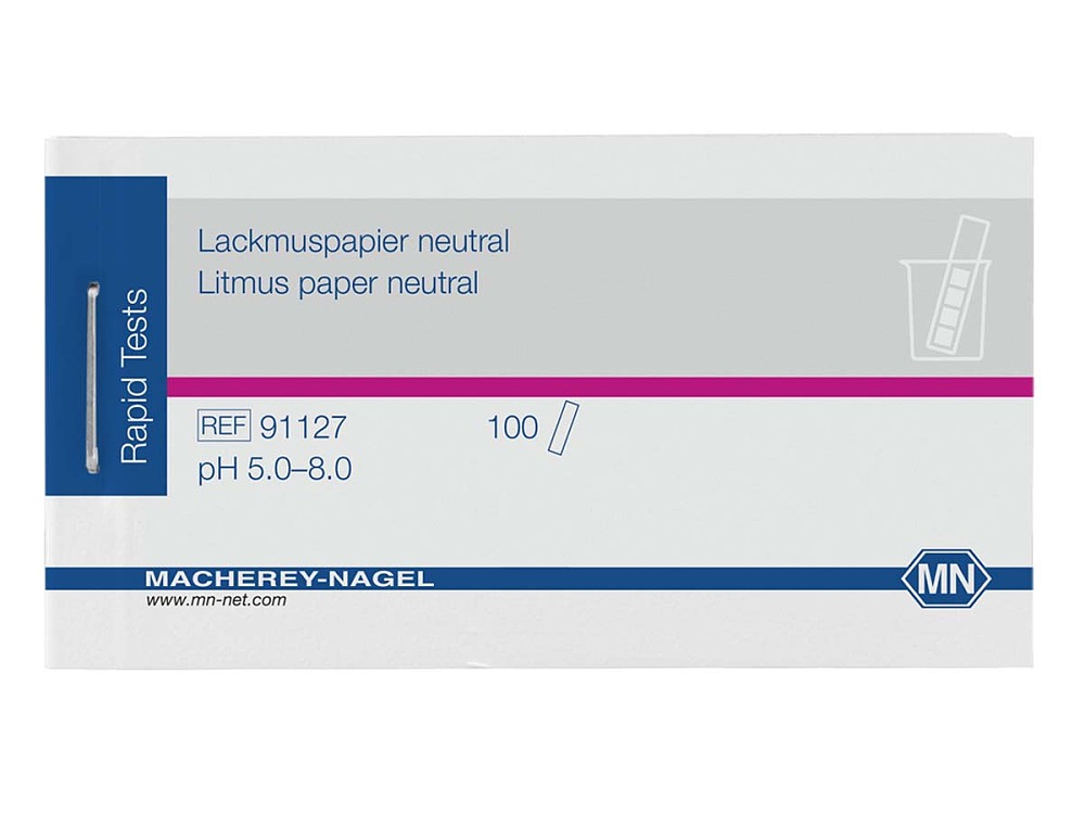 Qualitatives pH Testpapier Lackmuspapier neutral, pH: 5,0–8,0Farbumschlag von Violett nach Rot oder Blau, und zwar in Richtung Sauer Rot, in Richtung Alkalisch Blau.Bevorzugte Anwendung:Allgemeine Prüfung auf saure oder alkalische Reaktion: Prüfung beim Neutralisieren oder ob Übergang von Sauer nach Alkalisch oder umgekehrt bereits erfolgt ist. Lackmuspapier ist das bekannteste Indikatorpapier.Prinzip:Lackmus ist ein Naturprodukt und chemisch keine exakt definierbare einheitliche Substanz. Es wird aus Flechten gewonnen. Es dürfte sich um den ältesten Indikatorfarbstoff handeln.Technische Daten und Bestellinformationen Nachweisgrenze: pH - 5.0–8.0Farbwechsel: pH - rot → violett → blauLänge: 70 mmBreite: 10 mmHaltbarkeit (ab Produktion): 3 Jahr(e)Lagertemperatur: 4–30 °CLieferumfang: 100 Testpapiere in einem Heftchen