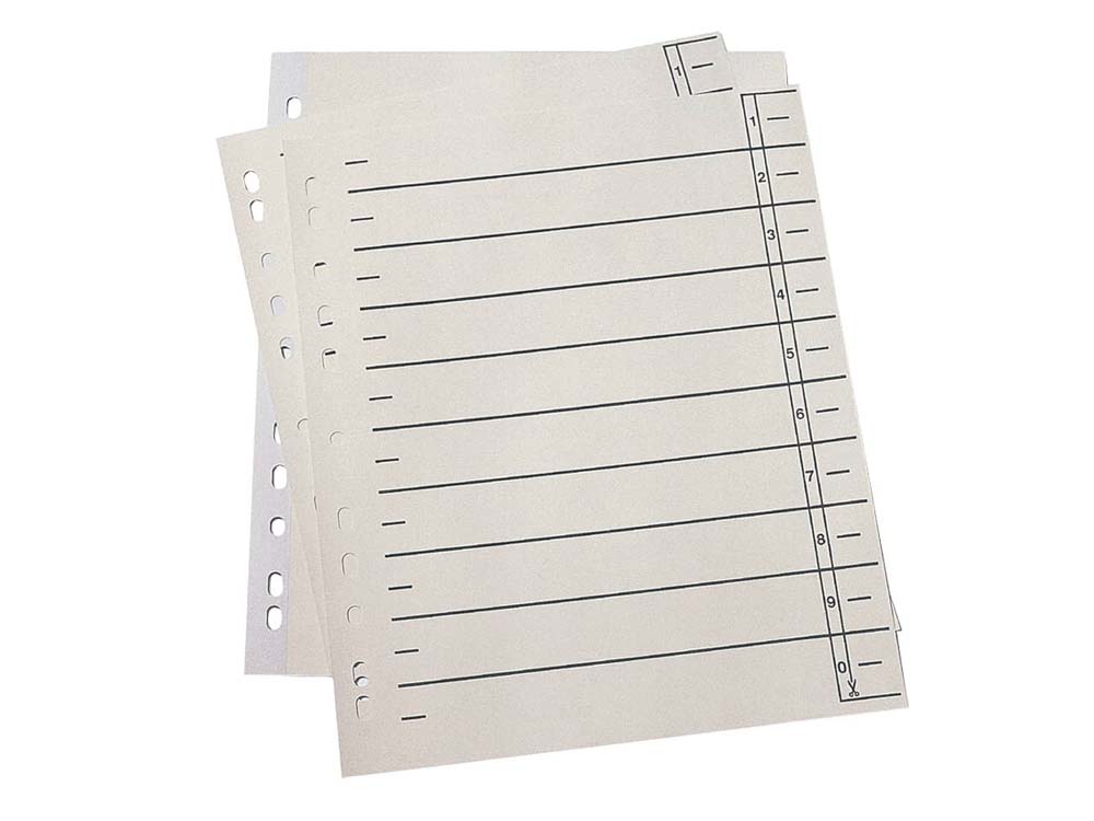 TrennblätterDie Register-Taben können an jeder Stelle ausgeschnitten werden. Linienaufdruck. Für A4, Eurolochung. Packung mit 100 Stück. Farbe: chamois- 190g/qm Kraftkarton (RC)- 190g/qm Kraftkarton (RC) Lochrand verstärkt- 230g/qm Kraftkarton