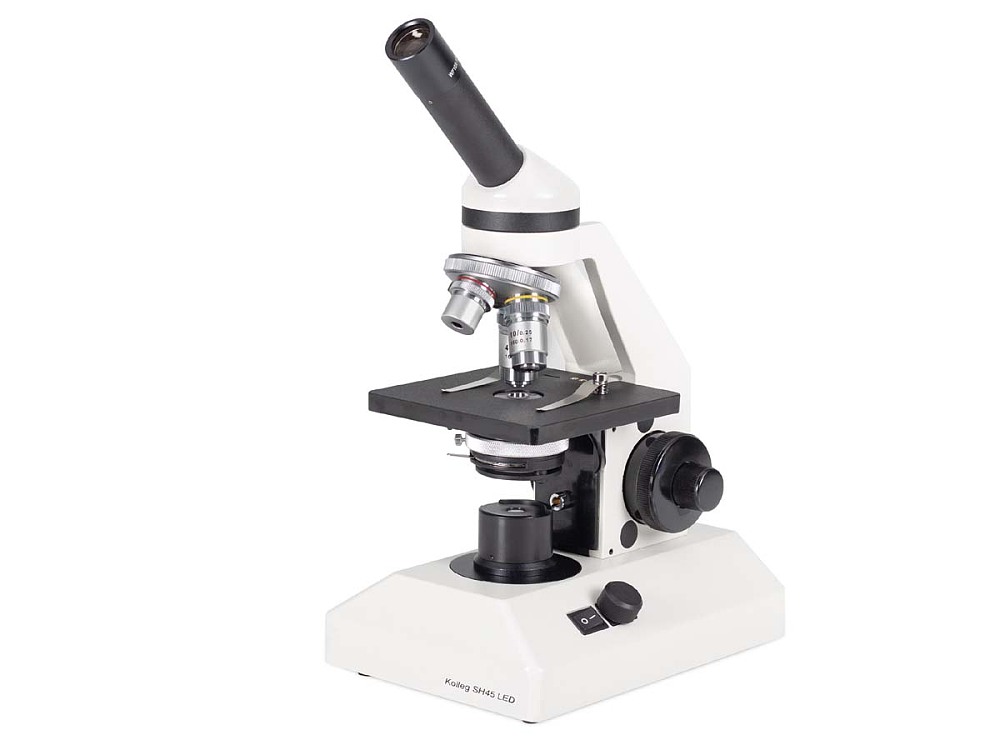 - Monokulartubus, 45° Einblickwinkel, 360° drehbar - Weitfeld Okular WF10X/18mm - 4-fach Objektivrevolver, vorwärts gerichtet - Achromatische Objektive 4X, 10X, 40X (Feder) - Koaxialer Grob- und Feintrieb - fokussierbarer 1.25 N.A. Abbe-Kondensor - Irisblende und Filterhalter - regelbare LED Beleuchtung 20mA, 3.5V, 70mW - Netzteil 100V-240V, VDE-Stecker (CE), inkl. Ladegerät und Batterien - Staubschutzhülle