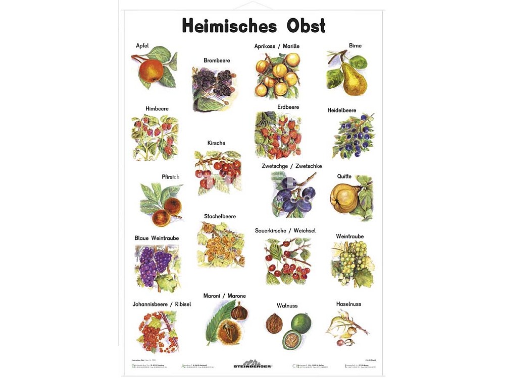 Lehrtafel - Heimisches ObstBildlehrtafeln 70 x 100 cm - mit Holzbeleistung und AufhängeschnurBeklebbar sowie Beschreib- und abwischbar Auswahl der bekanntesten heimischen Obstsorten, naturgetreue Darstellung des Obstes____________________________Hersteller:Stiefel Eurocart GmbHFelix-Wankel-Ring 13 aD-85101 Lentingeurocart@stiefel-online.de