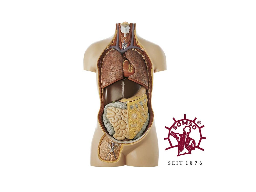 Jünglingstorso ohne KopfIn 12 Teile wie folgt zerlegbar:- Lungenhälften (2)- Herz (2)- Leber- Magen- Zwölffingerdarm mit Bauchspeicheldrüse- Dünn- und Dickdarm- Blinddarm zum öffnen- Blase- NierenhälfteAuf grünem Sockel.Höhe 71 cm (Torso 67 cm), Breite 39 cm, Tiefe 26 cm, Gewicht 8,7 kg