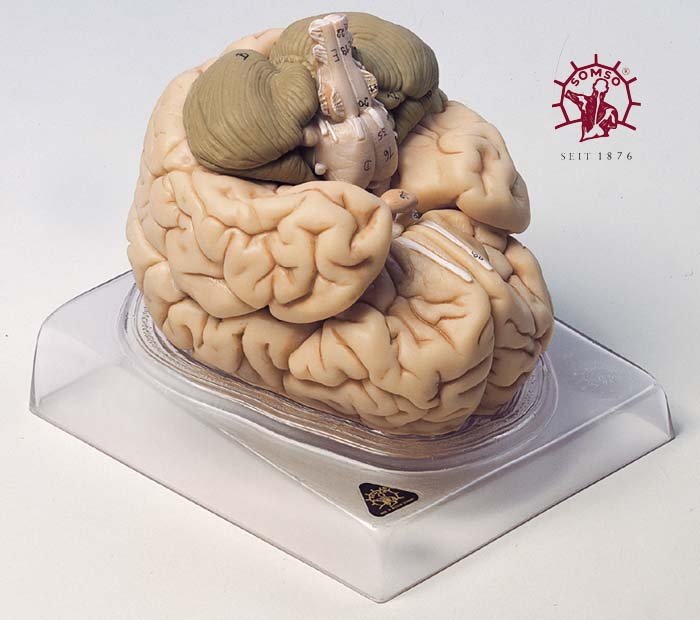 In 8 Teile zerlegbar: - Stirn- und Scheitellappen (2)- Schläfen- und Hinterhauptslappen (2)- Gehirnstamm (2)- Kleinhirn (2)Auf transparentem Sockel.Höhe 15 cm, Breite 16 cm, Tiefe 17 cm, Gewicht 1,1 kg